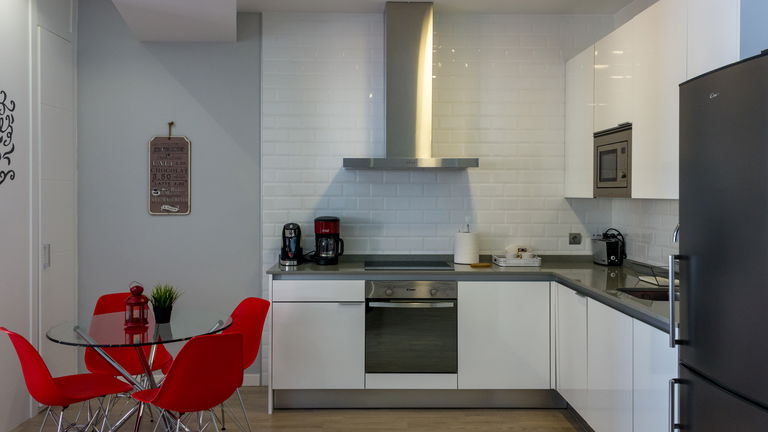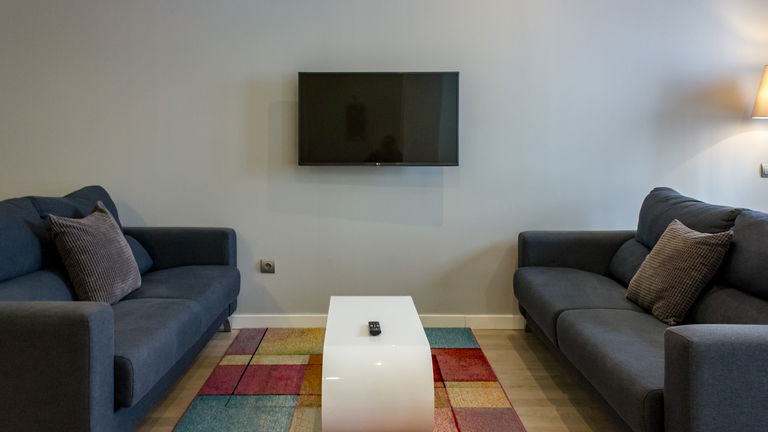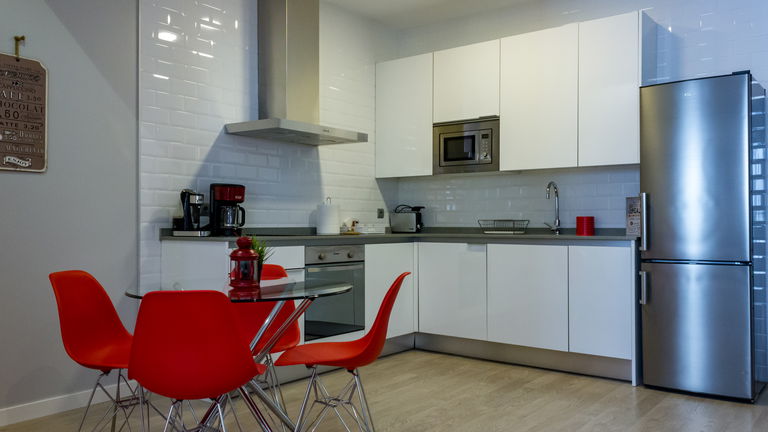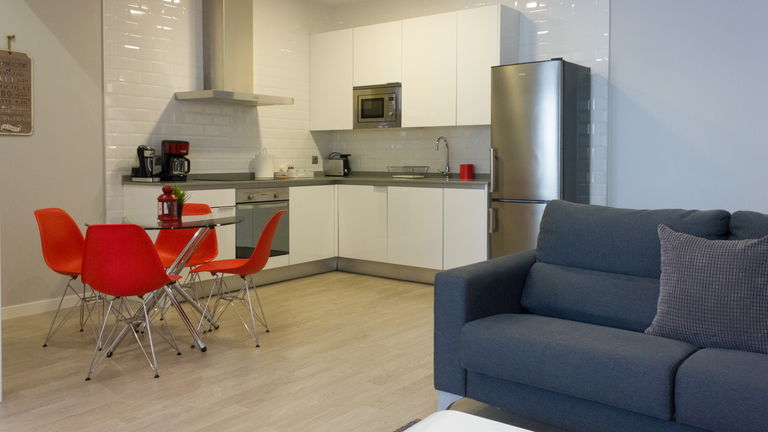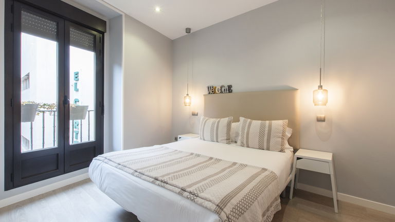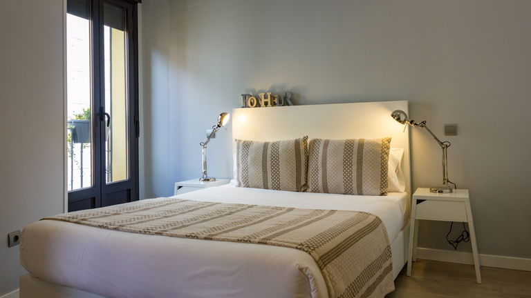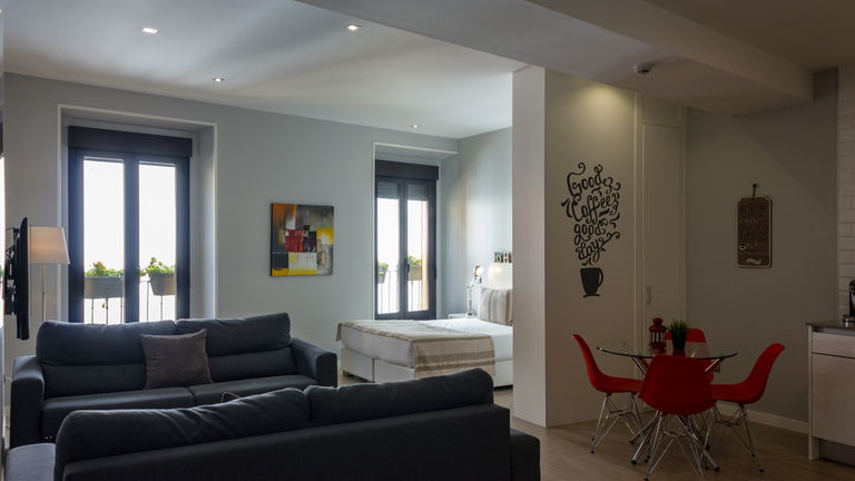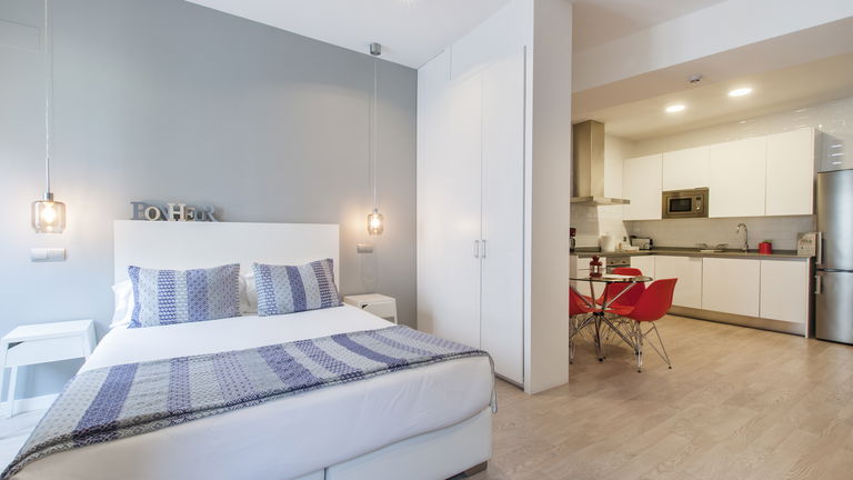 Ideal para parejas o estancias individuales, este luminoso estudio cuenta con dos balcones que llenan el espacio de luz natural. Está equipado con una cama matrimonial, un sofá cama y una cocina completa. Es perfecto para quienes valoran la funcionalidad sin renunciar al estilo.
